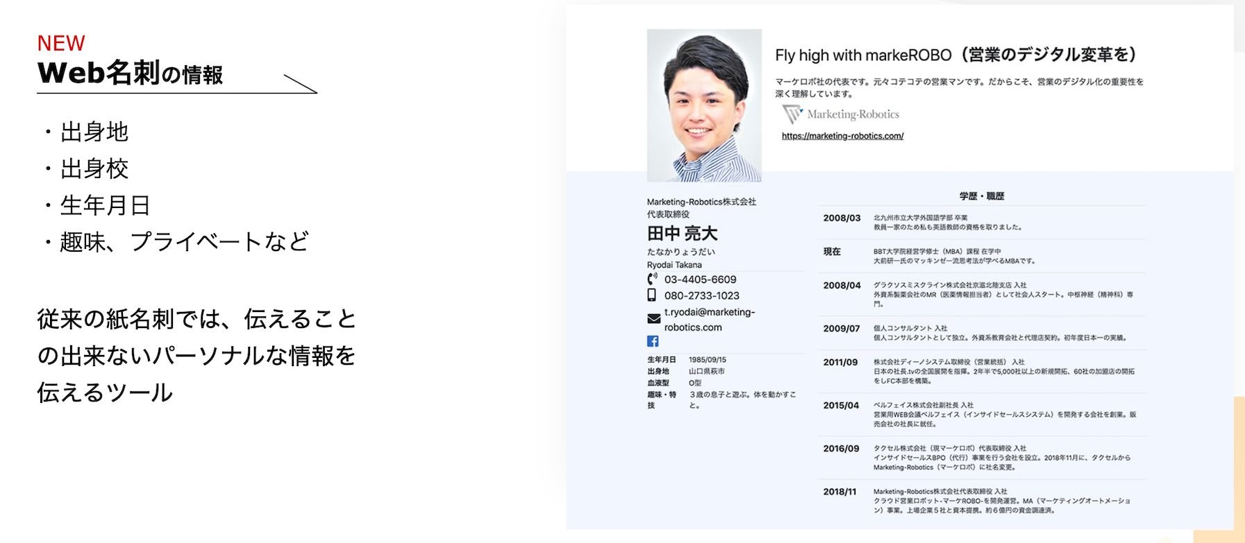普通の名刺では伝えることのできない、趣味や人生のビジョンなど「人」にフォーカスした情報を簡単に作成し伝えることができる