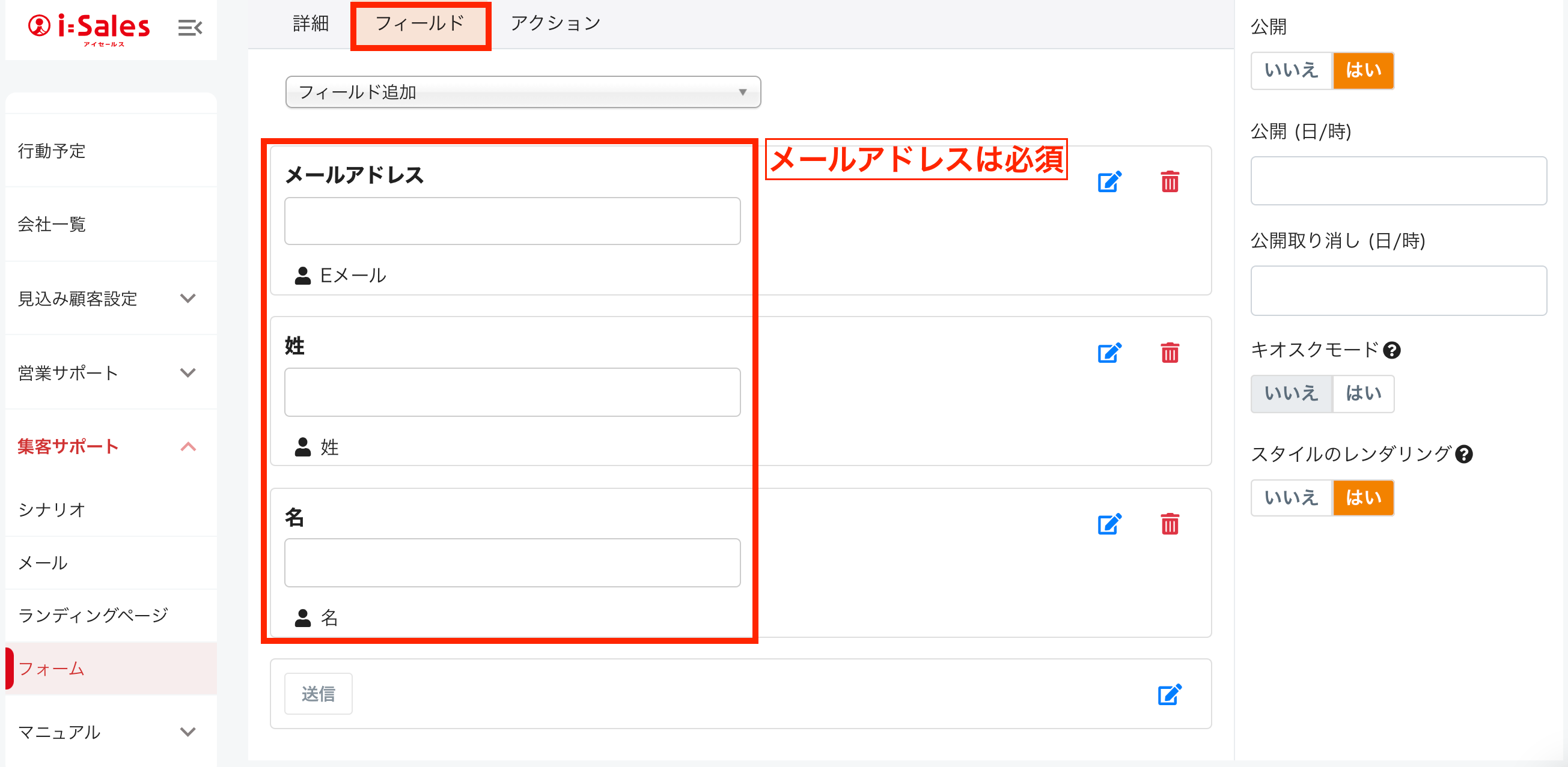 フィールドにて入力項目を作成する