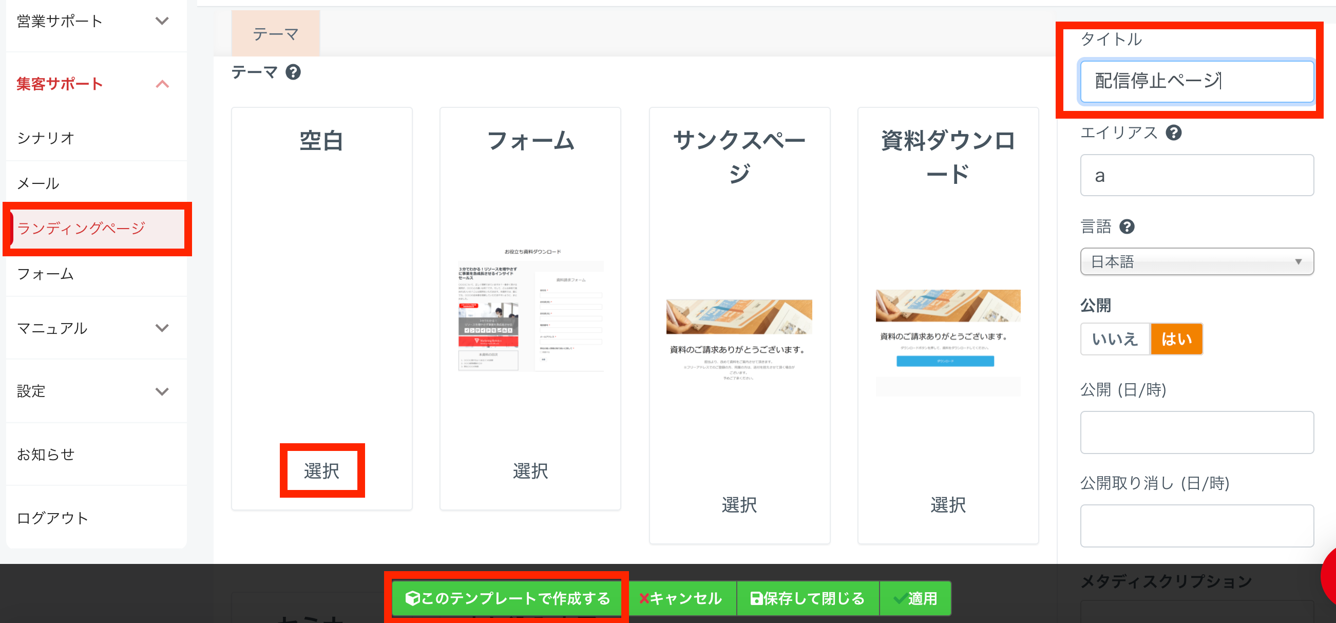 左メニューからランディングページをクリックし、タイトル・テーマを設定して