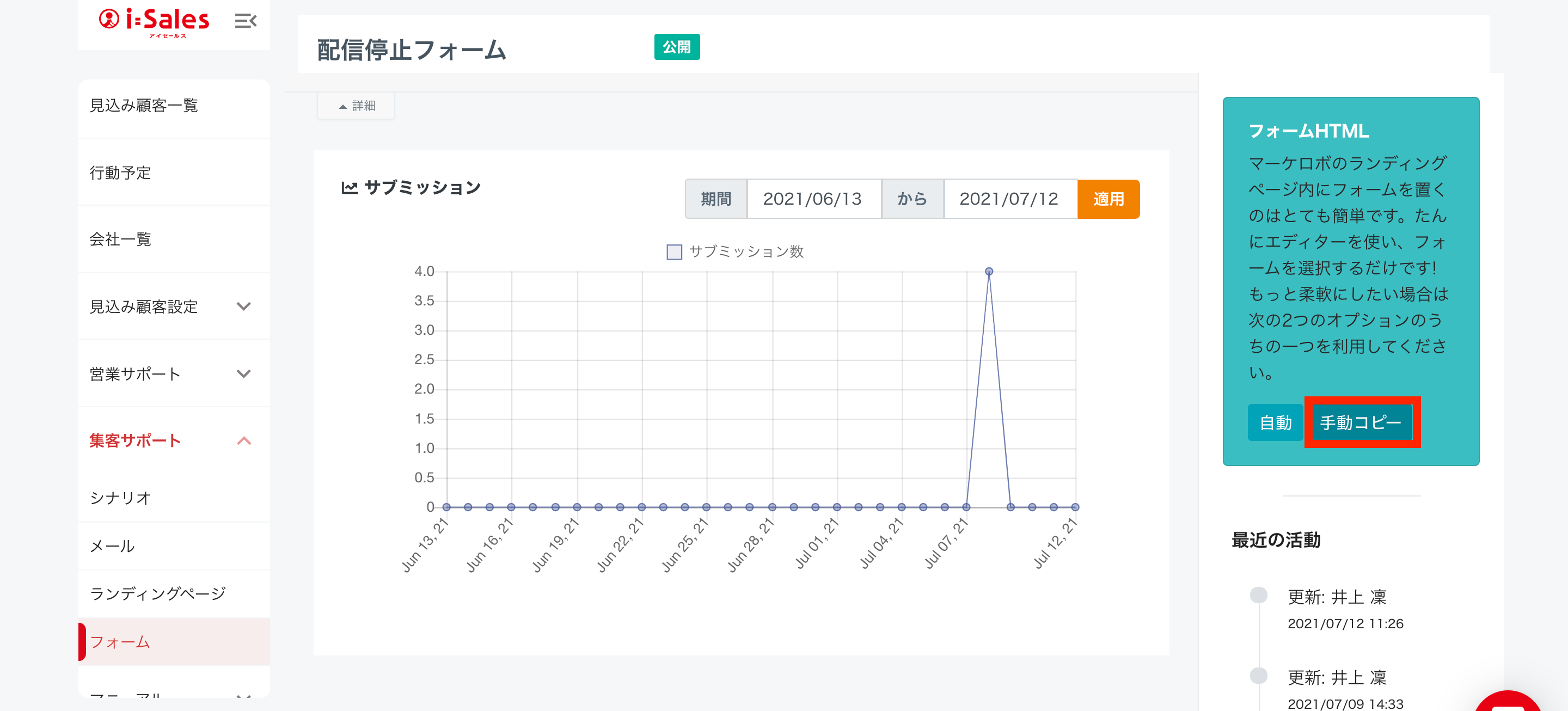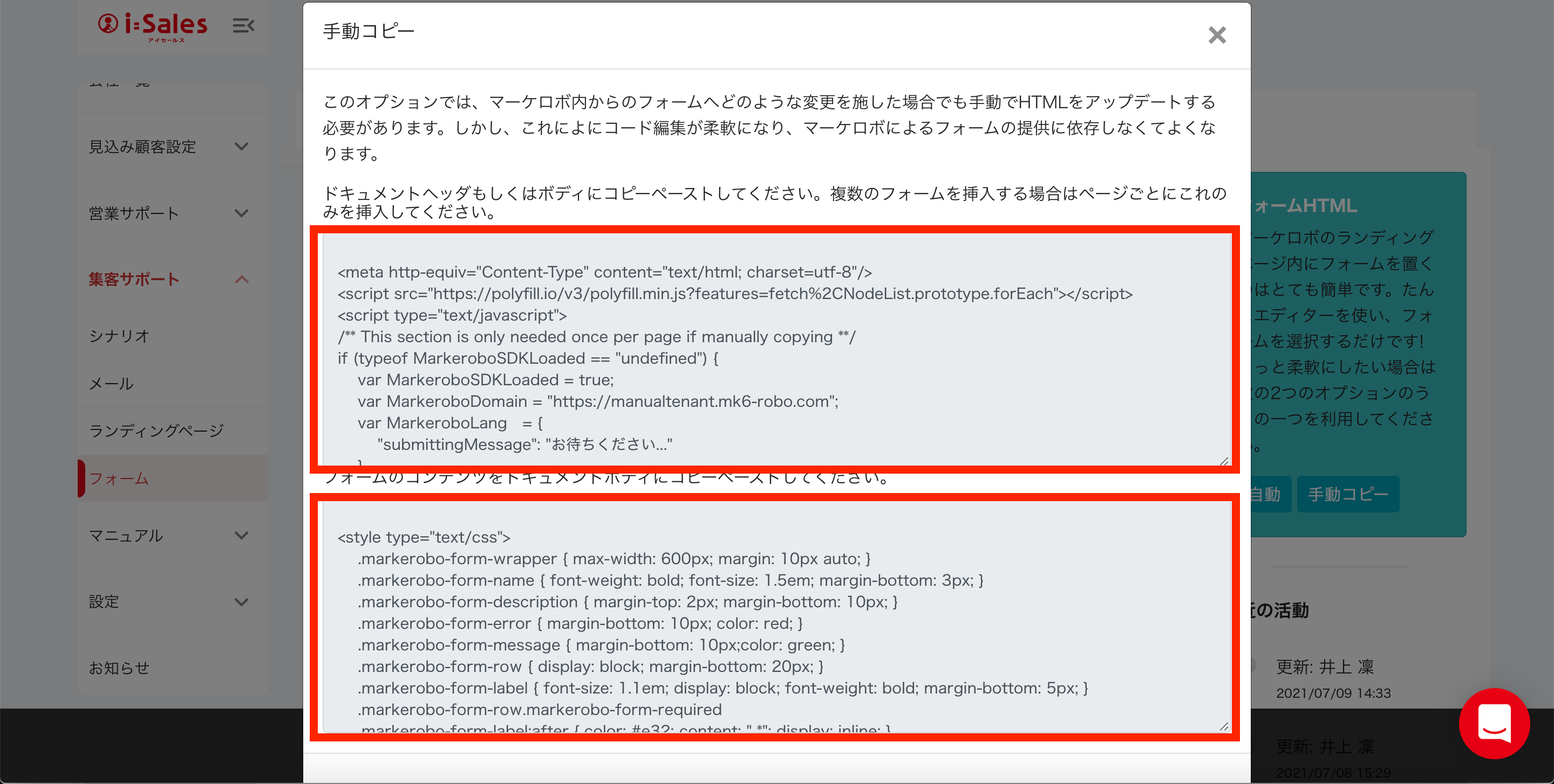 ・保存後に表示される画面で「フォームHTML」【手動コピー】ボタンを押す