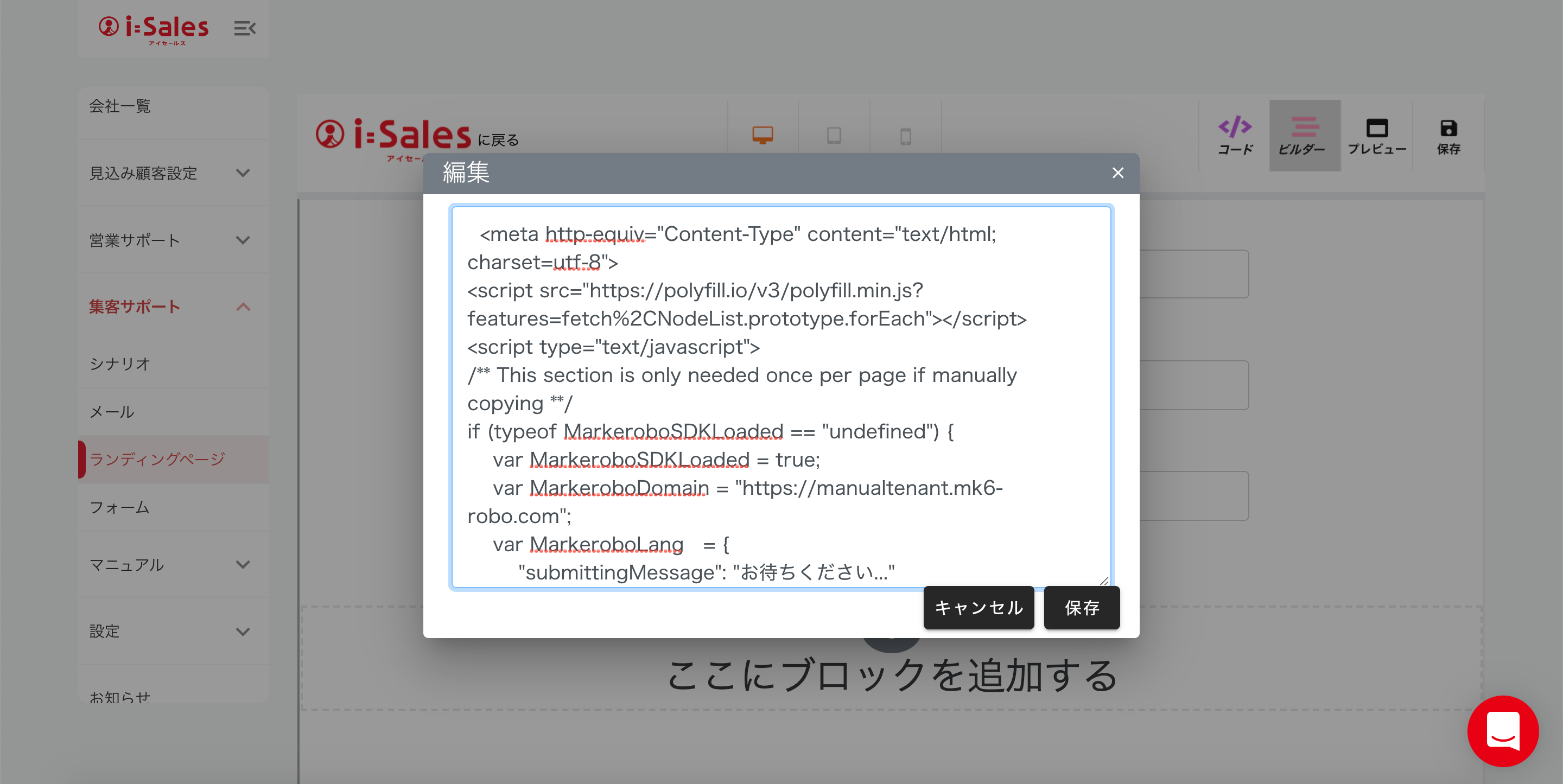 「ここにフォームの「手動コピー」に表示されるコードをすべてペーストしてください」というテキストがクリックされるので、先ほどコピーしたコードをすべて貼り付けます。貼り付けたら、「保存」ボタンをクリック。