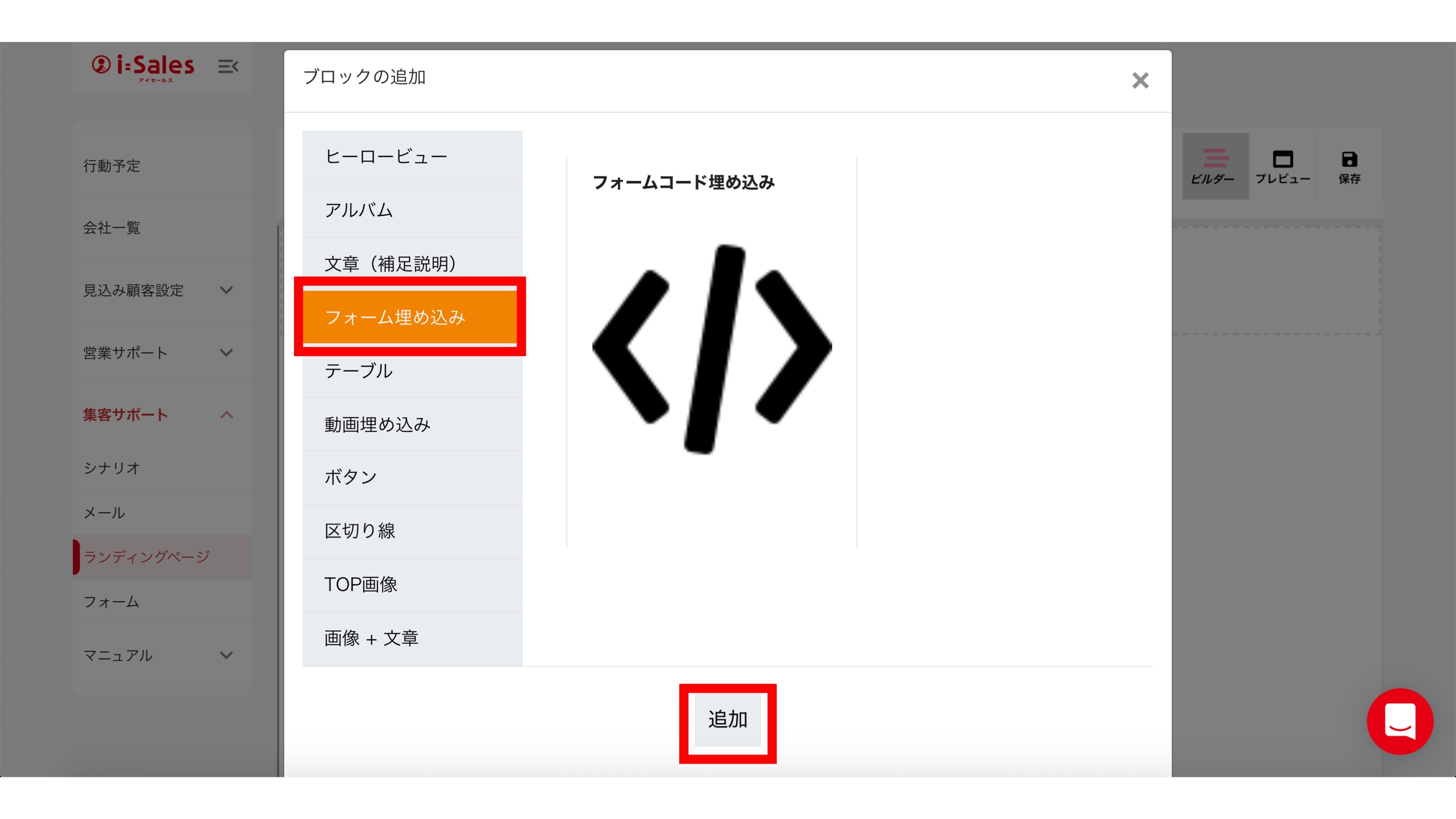 「フォーム埋め込み」を選択して、「追加」を選択