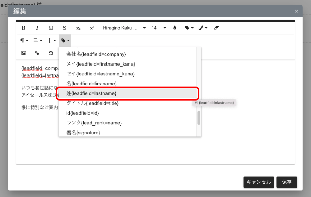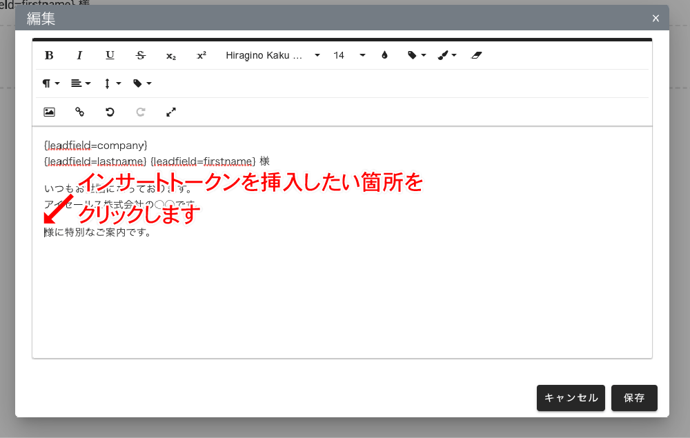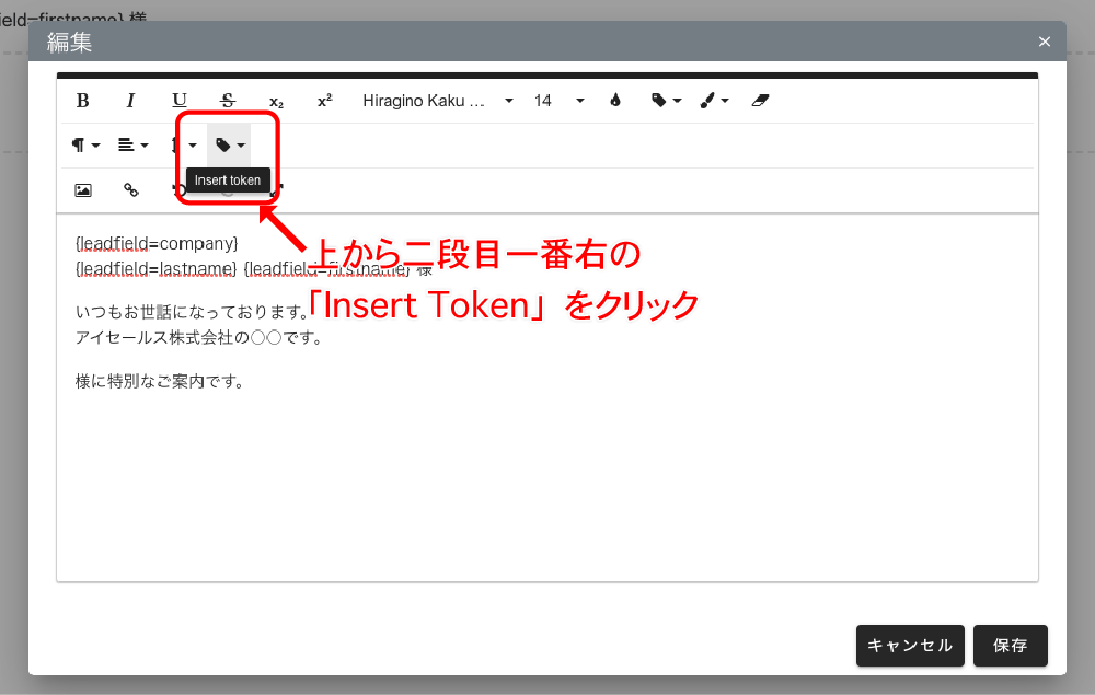 「インサートトークン」という機能を使用することで見込み顧客項目に保存された情報をメールに自動挿入することができます。