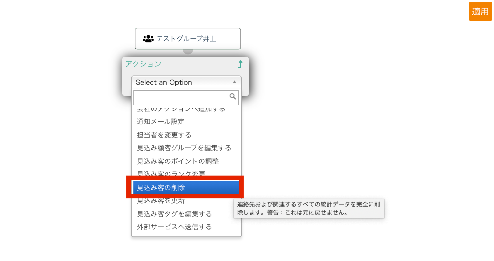 ②シナリオのアクションで、グループ内の「見込み客を削除」する