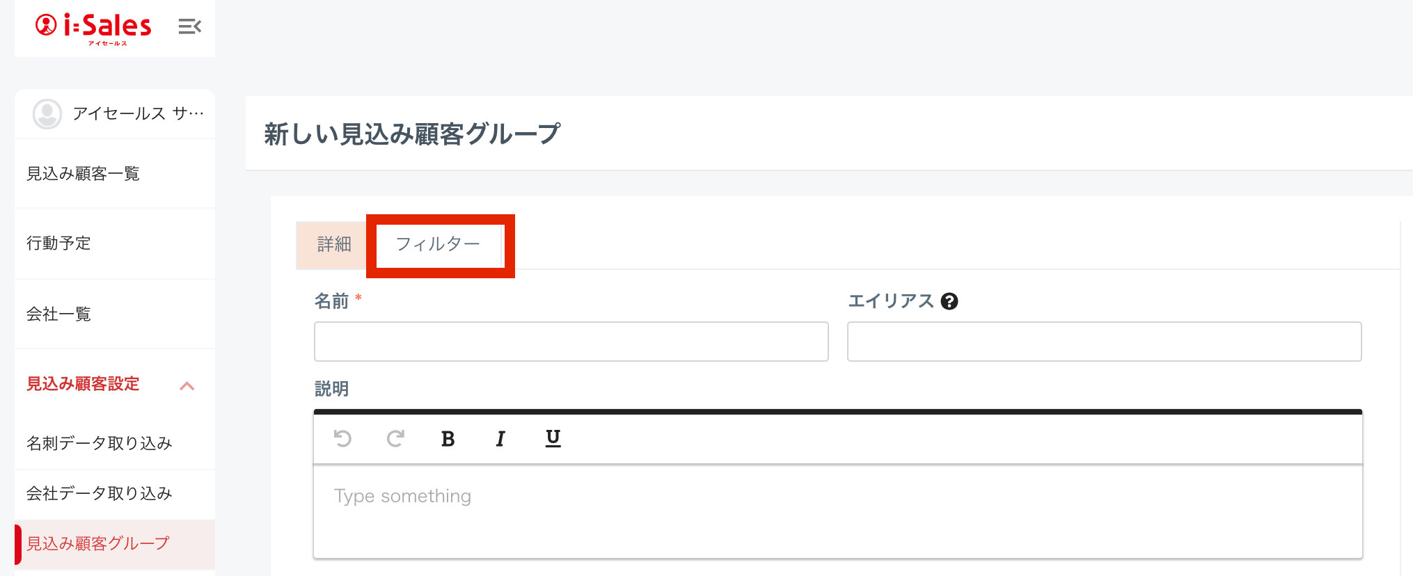 見込み顧客グループの一覧画面中央下にある「新規追加」ボタンを押すと下記の画面が出ますので、名前をつけた後に赤枠の「フィルター」ボタンを押します。