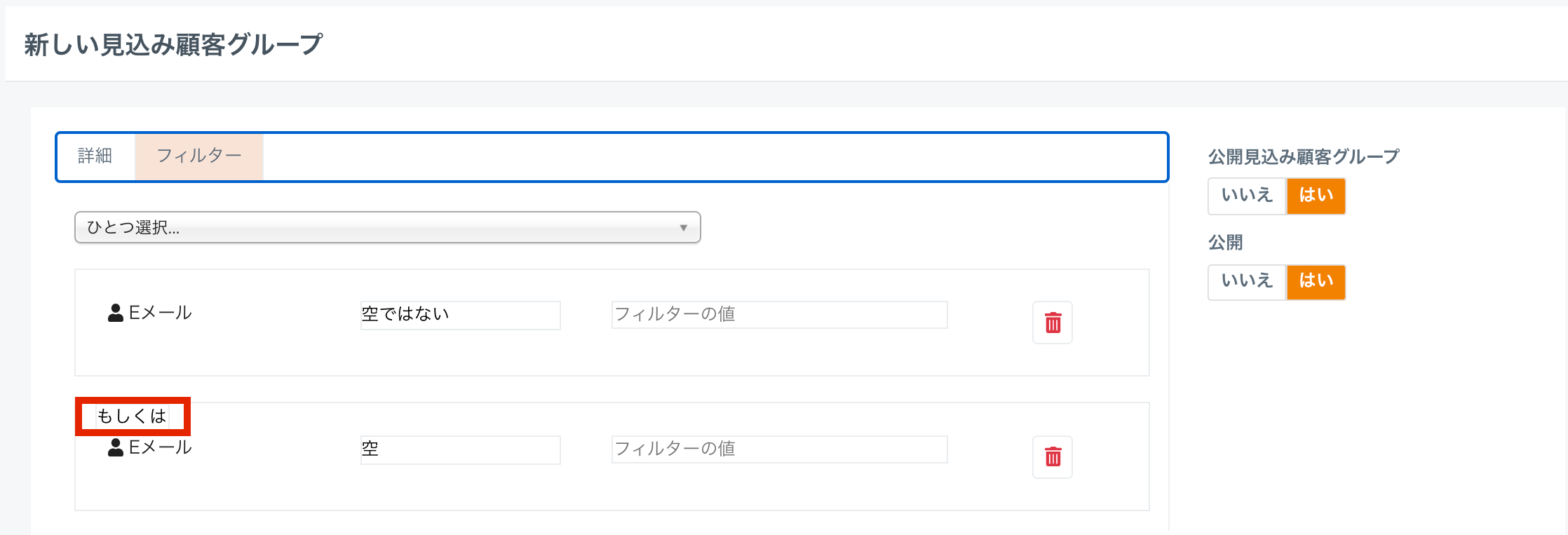 ①見込顧客グループのフィルター機能で、全見込み顧客が入ったグループを作成する