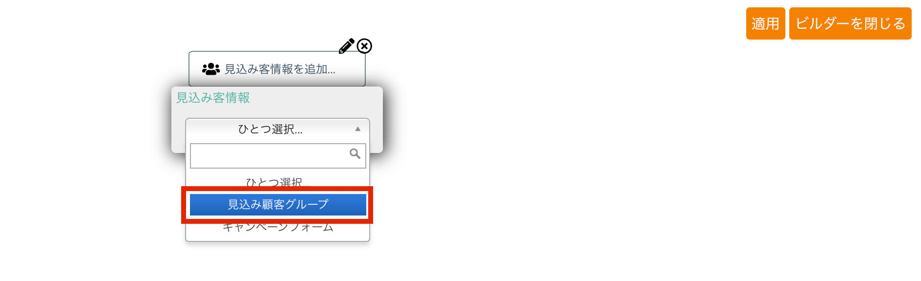 以下の新規キャンペーン画面で「見込顧客グループ」を選択し、①で作成したグループを選びます。