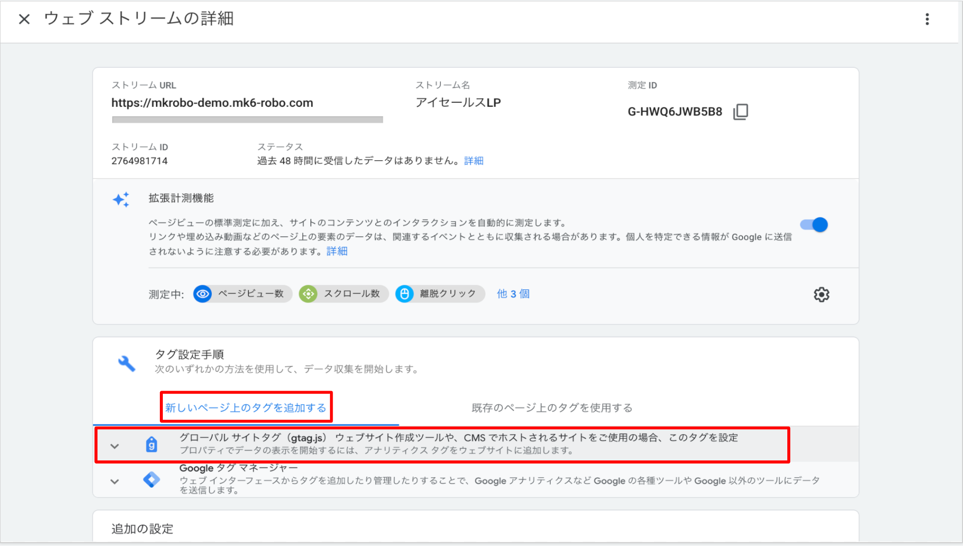 管理設定 >設定アシスタント > タグの設定 > データ ストリーム