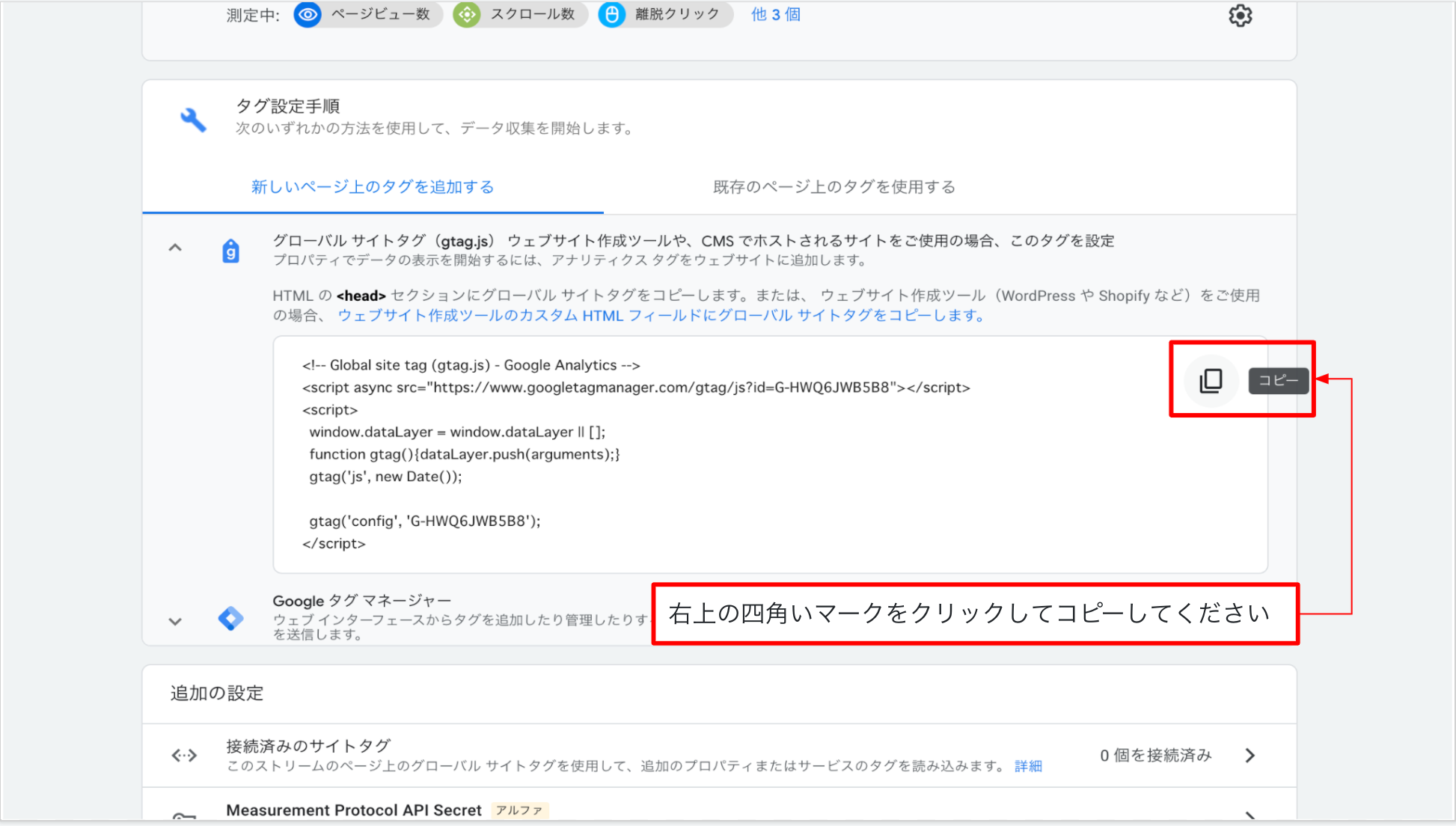 グローバル サイトタグ(gtag.js)をコピーグローバル サイトタグ(gtag.js)をクリックすると、タグが格納されたフィールドが展開される。