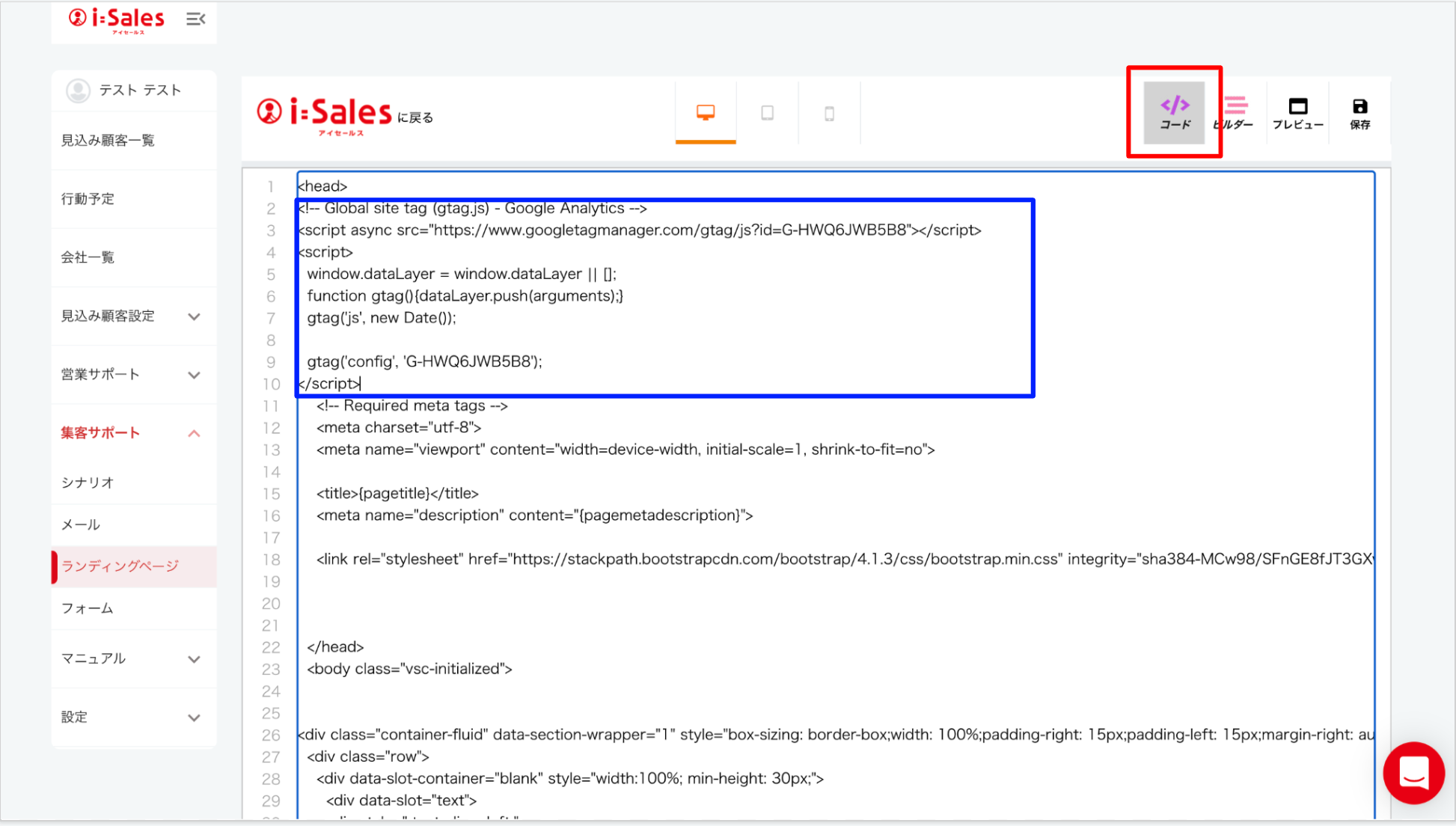 の下に グローバル サイトタグ(gtag.js)をペーストして保存。▲青枠で囲われれいるのがペーストされた グローバル サイトタグ(gtag.js)です。