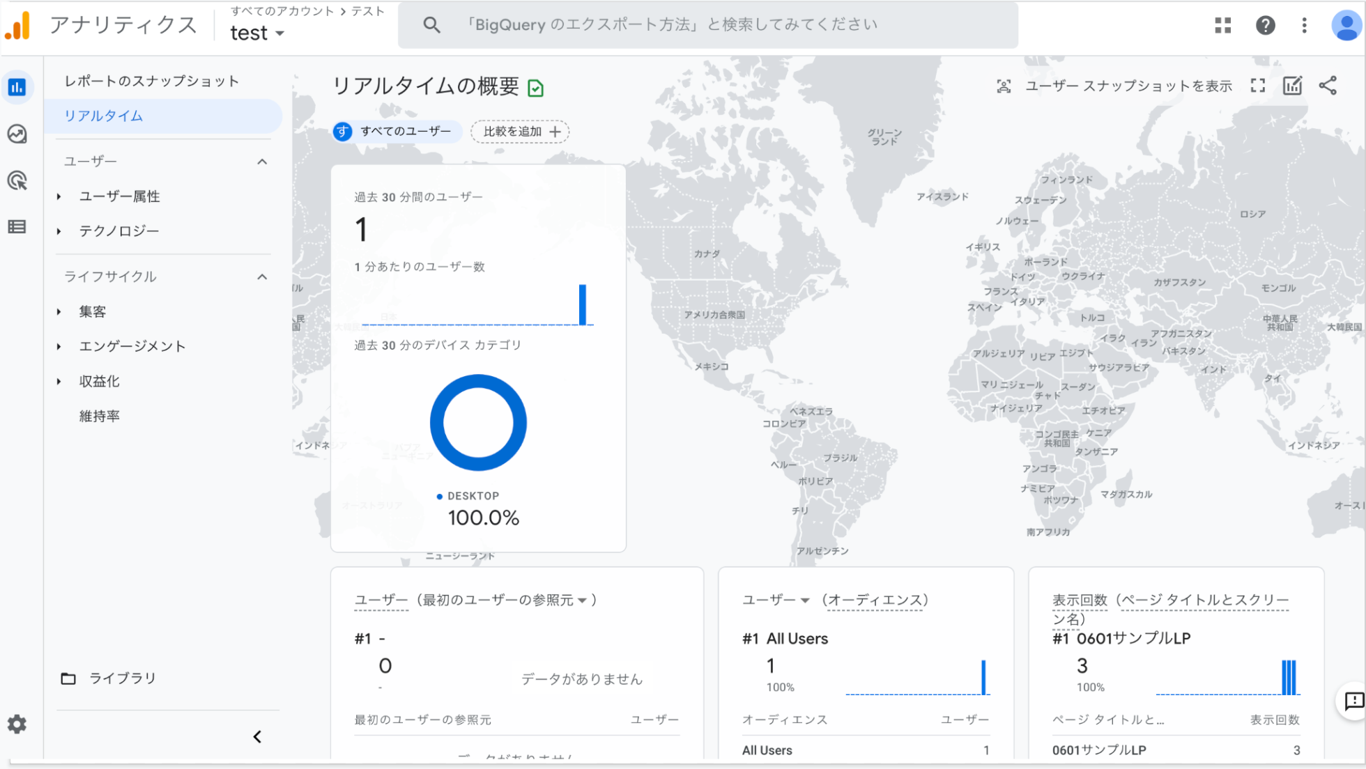 過去30分間のユーザー、ユーザー(オーディエンス別)等に1以上の数字が表示されていればgoogleアナリティクスが正常に動作してます。