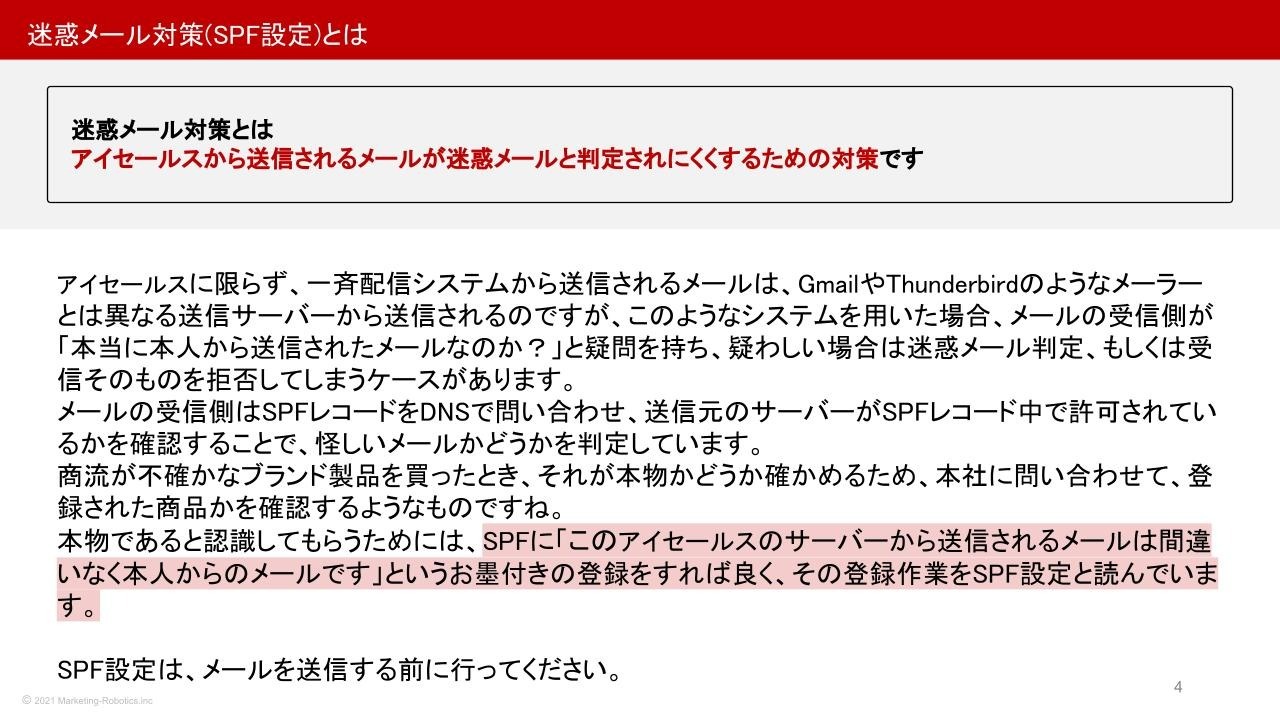 ピカパカ営業DXに限らず一斉配信されるメールは、メール受信側のシステムが迷惑メール判定、もしくは受信拒否をしてしまうケースがあります。そこで、迷惑メール対策(SPF設定)をすることで配信メールの信用度を高める必要があります。