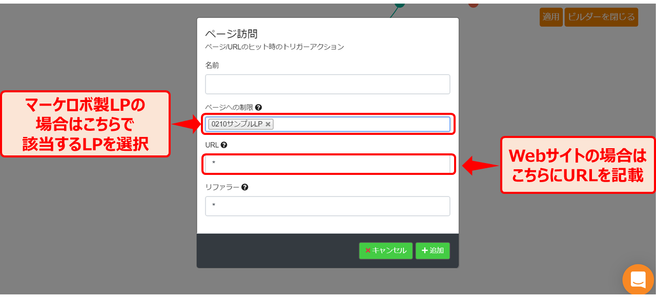 シナリオの「ページ訪問」で、対象となるLPもしくはwebサイトのURLが設定されていることを確認してください。