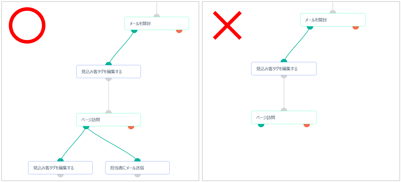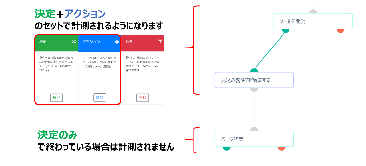 ページ訪問数を計測するには、「ページ訪問(緑)」を設定した後、「見込み客タグを編集する」や「担当者にメール送信」など何かしらの「アクション(青)」を設定する必要があります。